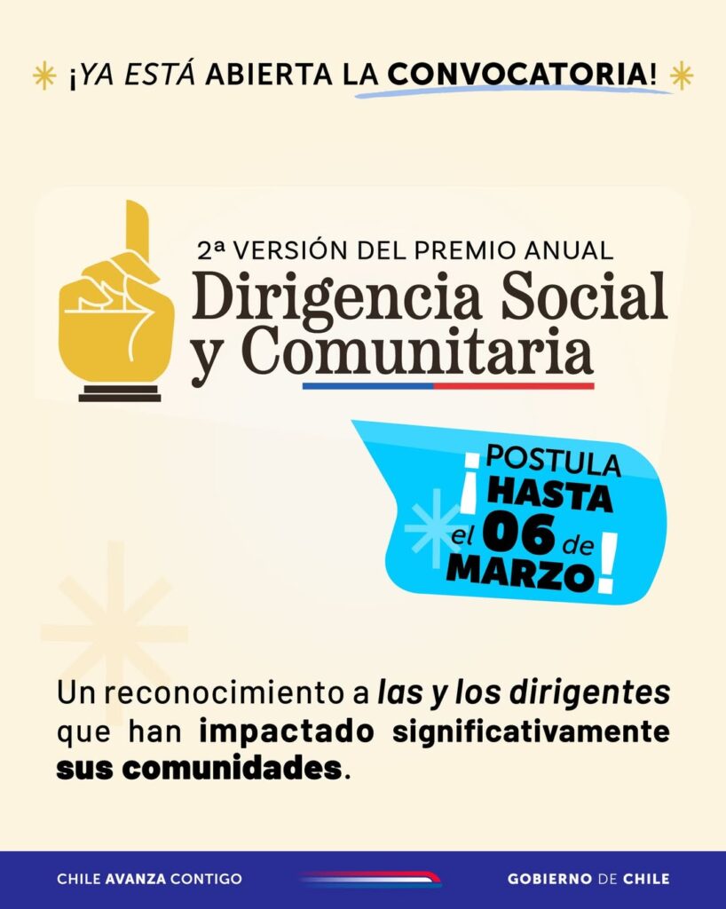 El Ministerio Secretaría General de Gobierno, a través de la División de Organizaciones Sociales, abrió la convocatoria para la segunda edición del Premio Anual Dirigencia Social y Comunitaria 2026. Esta es una instancia que reconoce el compromiso y liderazgo de quienes han aportado al bienestar social en sus comunidades. Las postulaciones estarán abiertas desde el 5 de febrero hasta el 6 de marzo de 2026, y podrán participar organizaciones sociales con personalidad jurídica vigente.