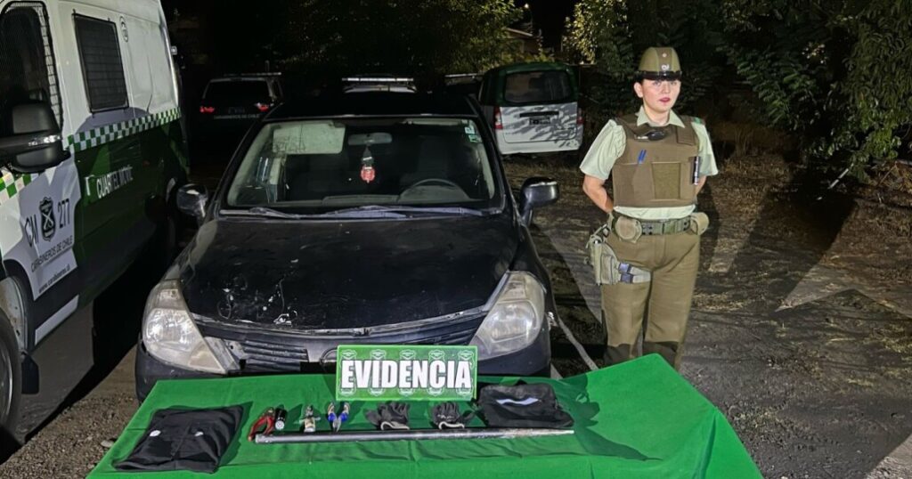 Durante la intervención se descubrió que en el vehículo viajaban cinco delincuentes, quienes portaban herramientas y varios objetos destinados a la comisión de delitos, incluidos pasamontañas, linternas y cuchillos, entre otros. Todos eran mayores de edad, con antecedentes delictivos y residían en la comuna de Mulchén. Fueron detenidos y llevados a la unidad policial.