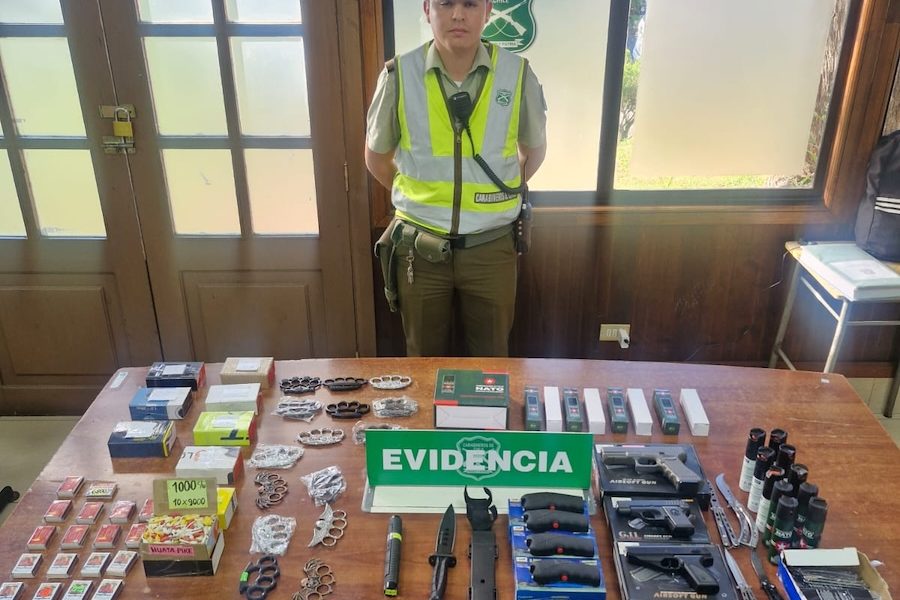 - La policía realizó una incautación de fuegos artificiales, pistolas de aire comprimido, manoplas, cuchillos de combate, gas pimienta y navajas mariposa, entre otros artículos.