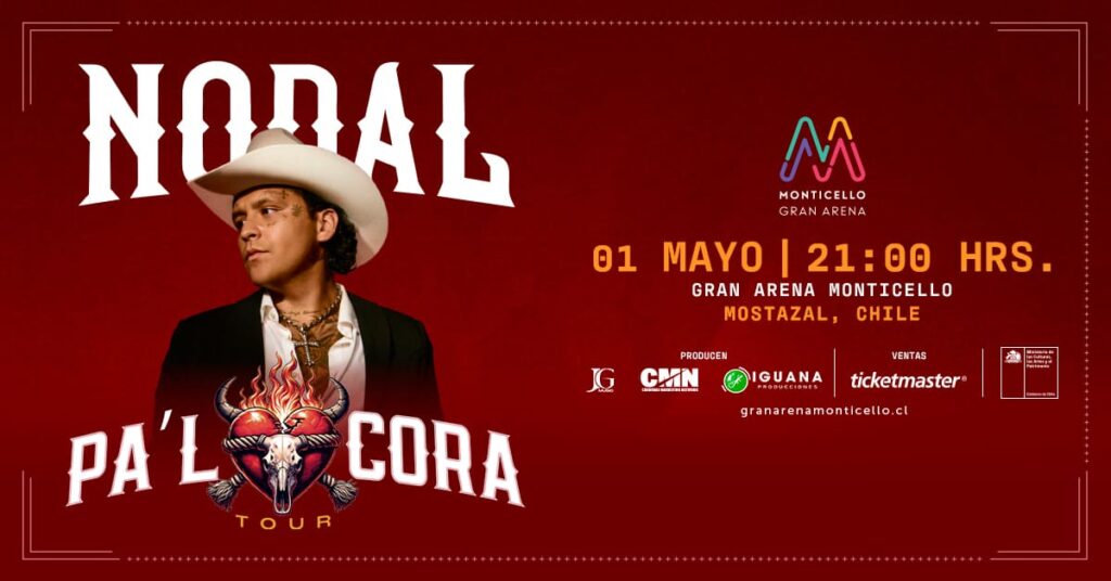 El concierto del “Pal Cora Tour 2026” en Gran Arena Monticello será una experiencia única para sus seguidores de la Región de O’Higgins, consolidando al recinto como uno de los favoritos para eventos de alta calidad. Nodal interpretará sus éxitos más grandes, convirtiéndose en uno de los artistas más influyentes de México y Latinoamérica.