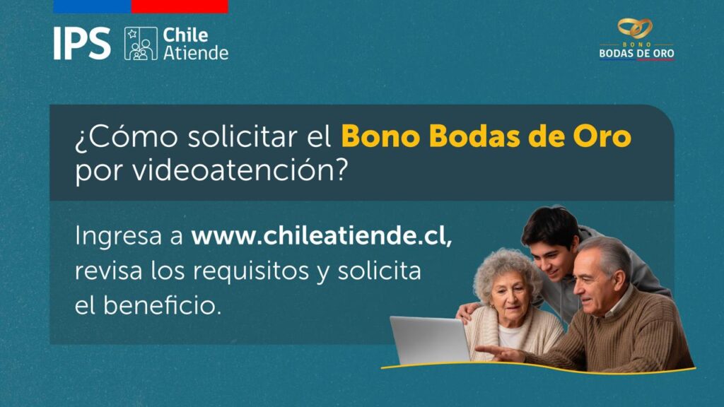 El Instituto de Previsión Social (IPS) hace un llamado a las más de 5 mil parejas que podrán acceder al Bono Bodas de Oro entre octubre y diciembre de 2025, al cumplir sus 50 años de matrimonio, junto con los demás requisitos. Pueden hacer el trámite de forma rápida y fácil por medio de la videoatención en chileatiende.cl o ips.gob.cl, y ambos cónyuges deben solicitarlo juntos.