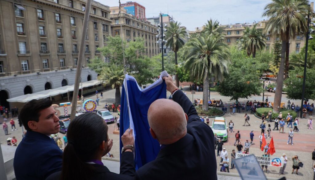 Durante una conferencia de prensa tras el cambio de mando, los miembros de la nueva administración retiraron los emblemas identitarios y los sustituyeron por dos banderas chilenas y dos del municipio de Santiago.