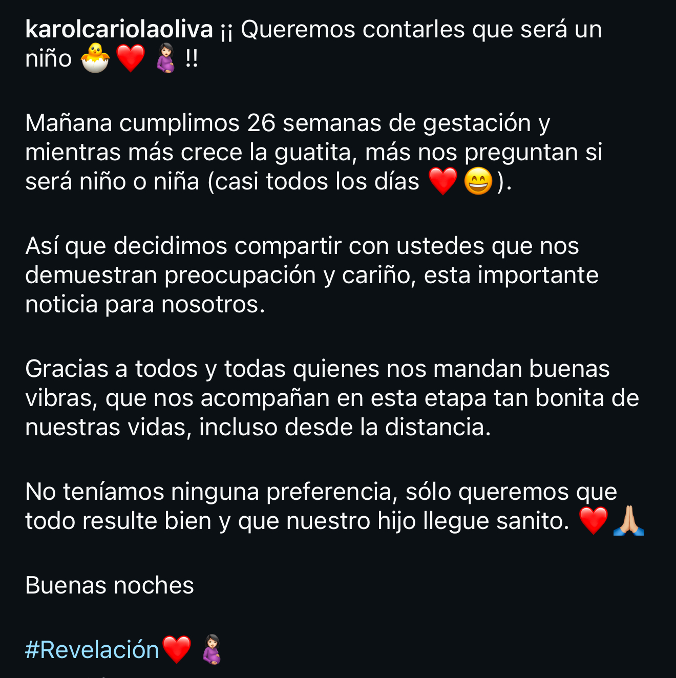 «Decidimos compartirlo con ustedes, quienes nos demuestran su cariño y preocupación en esta importante noticia para nosotros», agregó la exdirigenta estudiantil.