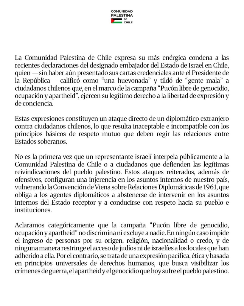 La Comunidad Palestina en Chile ha reaccionado a esto mediante un comunicado en el que condena los comentarios de Lewi. “La Comunidad Palestina en Chile expresa su más enérgica condena a las recientes declaraciones del embajador del Estado de Israel en Chile, quien —sin haber presentado aún sus cartas credenciales— descalificó a ciudadanos chilenos que ejercen su legítimo derecho a la libertad de expresión en la campaña ‘Pucón libre de genocidio, ocupación y apartheid’”, menciona el comunicado, añadiendo que “estas expresiones constituyen un ataque directo de un diplomático extranjero contra ciudadanos chilenos, lo que resulta inaceptable según los principios básicos de respeto mutuo que deben regir las relaciones entre Estados soberanos”.