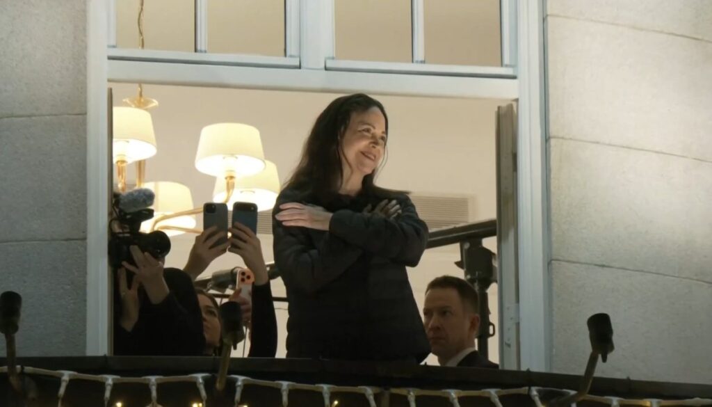 Aunque no asistió a la ceremonia, tras su llegada a la capital noruega y un encuentro con su familia, la líder opositora salió al balcón del Gran Hotel alrededor de las 02:20 hora local para saludar a un grupo de venezolanos que la esperaban cantando el «Gloria al Bravo Pueblo», himno nacional de Venezuela.