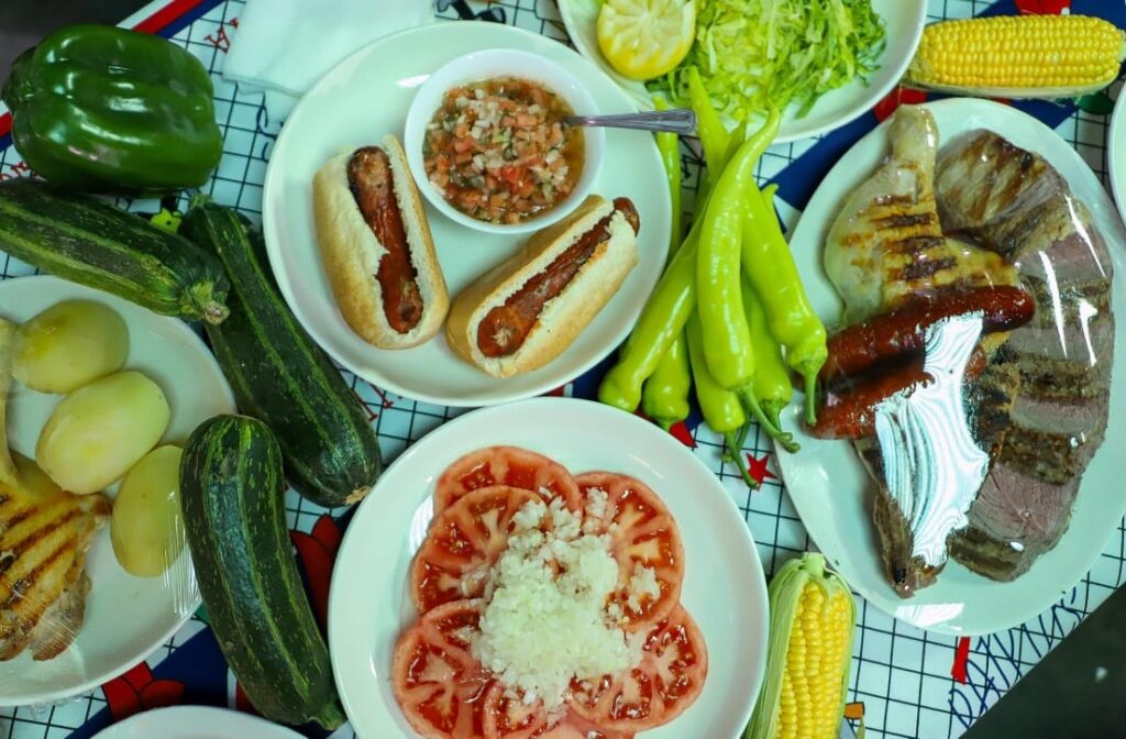 Opción 2: Sobrecostilla, pulpa de cerdo con hueso, longaniza, papas, lechuga, tomate, cebolla, cilantro, ají verde, limón, marraqueta, empanada de pino y carbón.