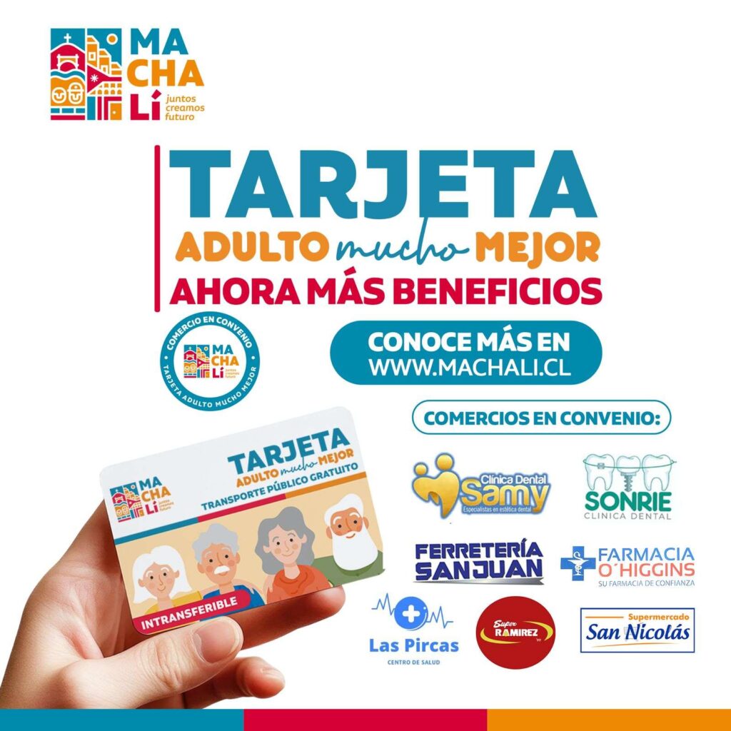 Además del Transporte Gratuito en la locomoción pública de buses entre Machalí, Coya y Rancagua, la Tarjeta Adulto Mucho Mejor está disponible para todos los mayores de 65 años que residan en Machalí.