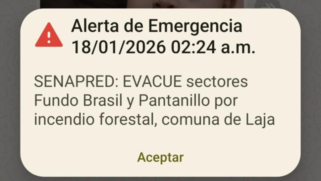 A las 02:25 horas, se activó la alerta SAE en todos los teléfonos móviles de la ciudad de Laja, ordenando la evacuación de los sectores del Fundo Brasil y Pantanillo.