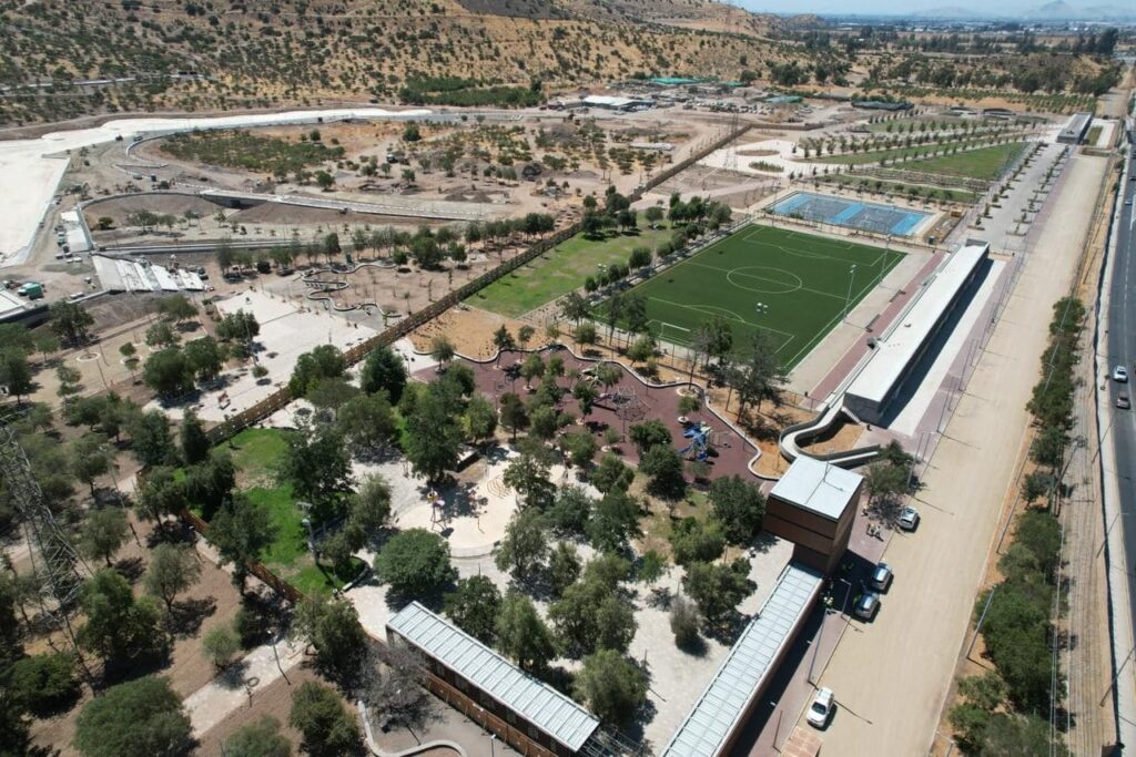 El Parque Cerro Chena, que incluye áreas verdes, infraestructura deportiva y espacios recreativos, es un proyecto del Gobierno de Santiago que se espera inaugurar a principios de 2026.