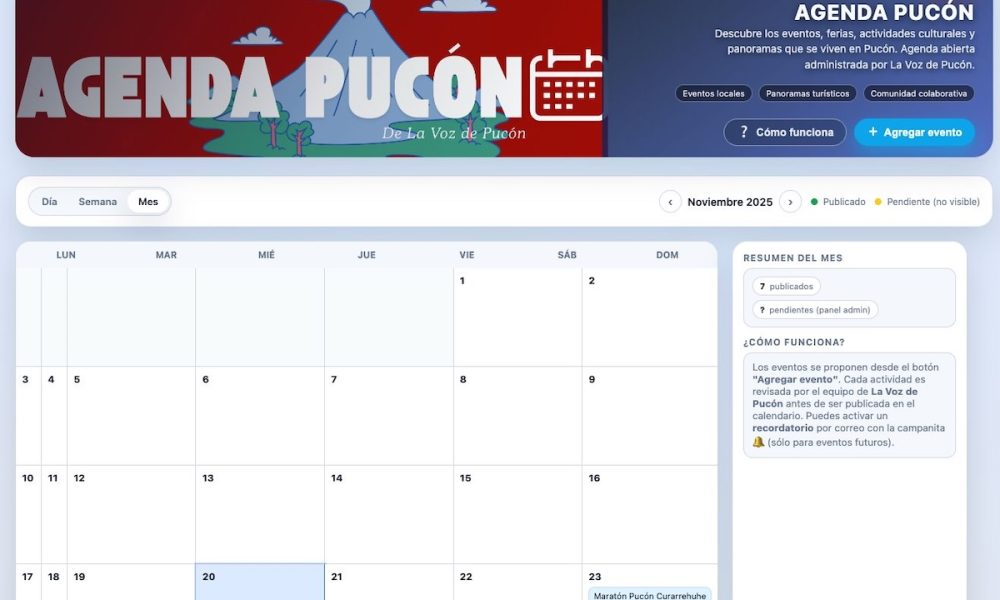 Pucón cuenta con un calendario vibrante y diverso, pero muchas actividades quedan en el olvido por la falta de un espacio único donde estén disponibles. Para solucionar este problema, se lanza oficialmente Agenda Pucón (www.agendapucon.cl), una plataforma abierta, colaborativa y gratuita creada por La Voz de Pucón para consolidar todos los eventos locales en un solo lugar.