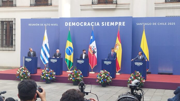Este lunes, el presidente Gabriel Boric se reunió en La Moneda con cuatro mandatarios y jefes de Gobierno de Uruguay, Colombia, Brasil y España, en la cumbre “Democracia Siempre”. Durante el encuentro, firmaron un documento que reafirma la importancia de este sistema de gobierno y el multilateralismo. Boric enfatizó que esta reunión fortalece el compromiso de los países presentes con la democracia, mientras que Lula Da Silva, su par brasileño, subrayó la necesidad de enfrentar los extremismos. La Oposición no tardó en criticar la cumbre, y se planea una nueva reunión internacional para septiembre.