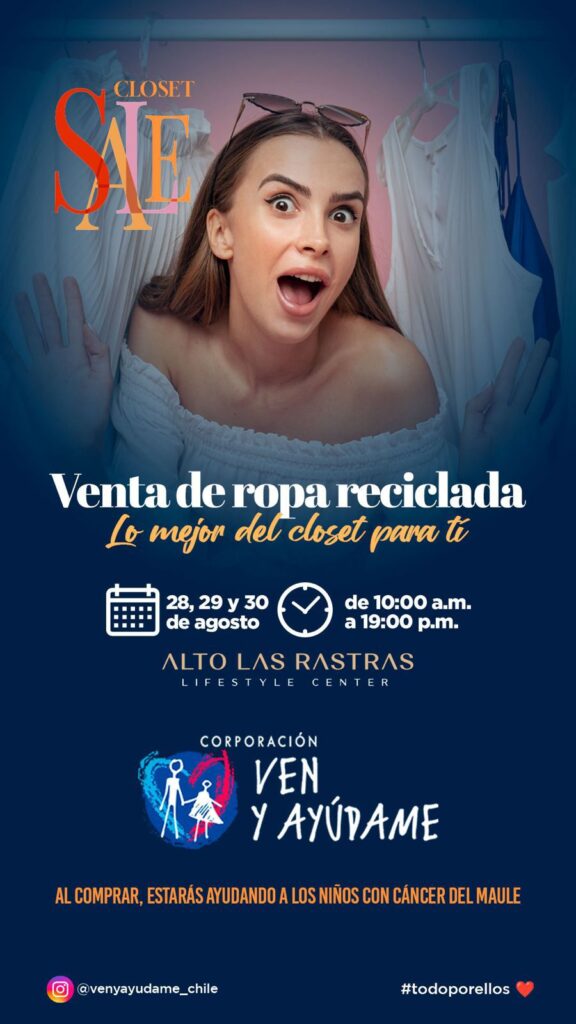 Una parte de las ganancias obtenidas de la venta de ropa se destinará a la Corporación Ven y Ayúdame, que apoya a niños con cáncer en la región del Maule. Además, esta iniciativa promueve la economía circular, ofreciendo una segunda vida a prendas ya existentes y ayudando al medio ambiente.