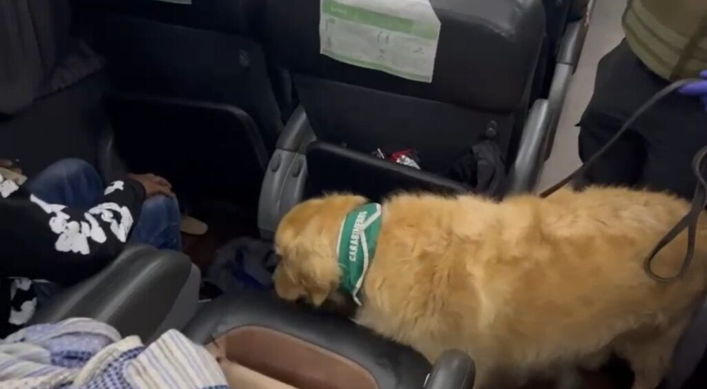 Durante la revisión, un perro especializado en detectar drogas alertó sobre una mochila que parecía sospechosa. Al revisarla, los efectivos encontraron un paquete ovalado envuelto en cinta adhesiva, el cual contenía varios envoltorios con una sustancia blanca y otro de origen vegetal.