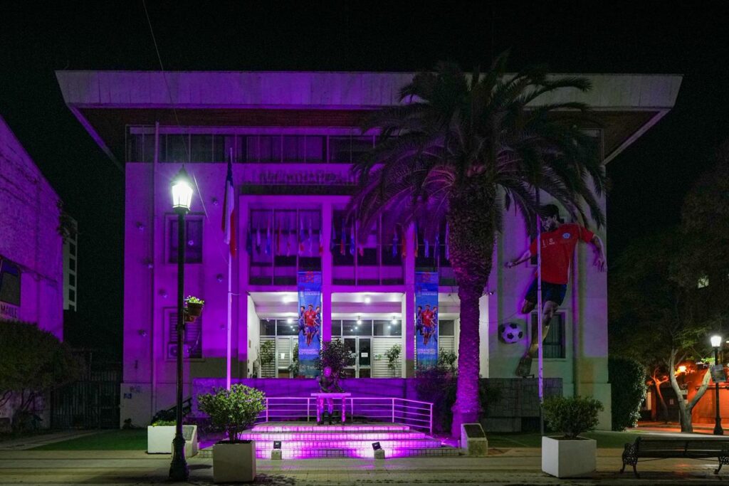 Por otra parte, el puente que une la Alameda con el Cerro La Virgen fue adornado con luces neón rosadas en su parte inferior, generando un efecto visual continuo entre los botes del río y el Parque Río Claro. La fachada de la Municipalidad de Talca también se iluminó de color rosado, convirtiendo este emblemático edificio en un símbolo de concientización. La Plaza de Armas, frente al edificio municipal, se sumó a la iniciativa con postes iluminados de rosado, reforzando el mensaje de lucha contra el cáncer de mama.