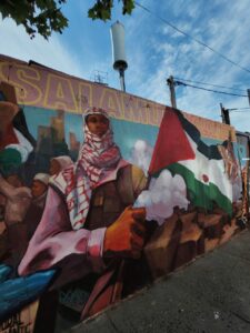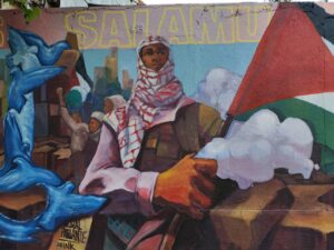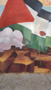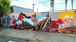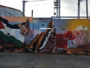 El mural reúne símbolos que evocan dignidad y lucha: amapolas, mariposas, la bandera palestina y la figura de un luchador con kufiyya que saluda con un As-Salamu Alaykum. Su mensaje convoca a la empatía y recuerda que el arte es también un espacio de resistencia y solidaridad.